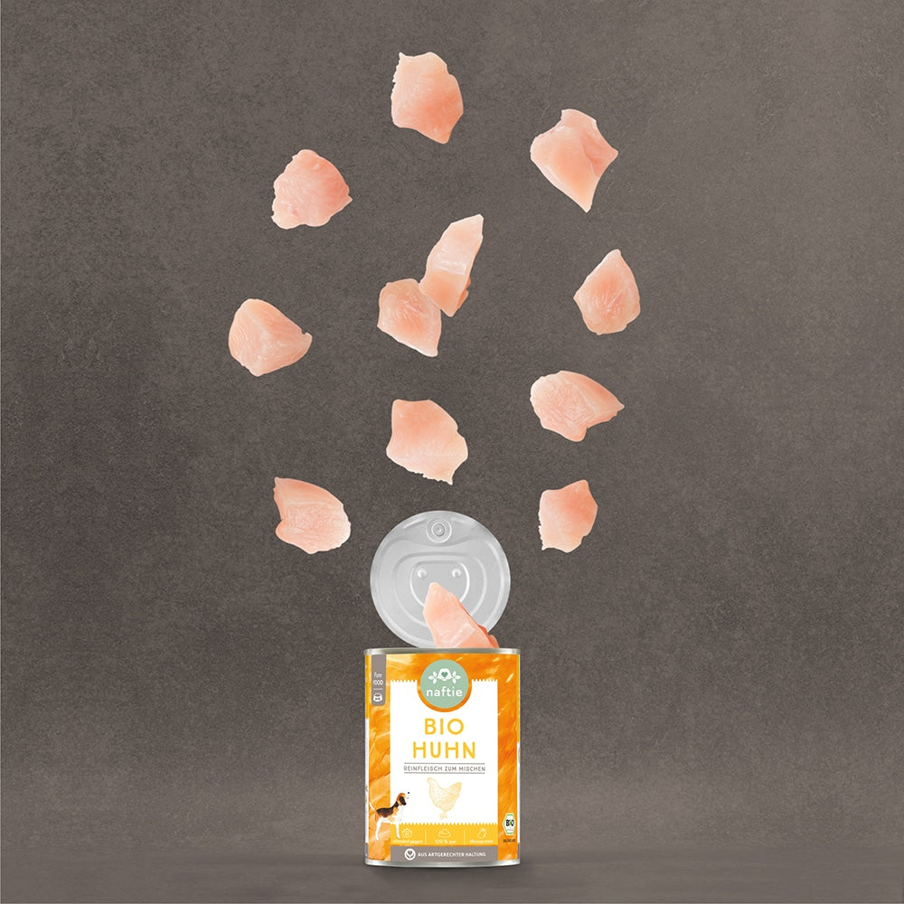 Gönne deinem Vierbeiner das Beste aus biologischer Landwirtschaft – mit naftie Huhn BIO Nassfutter in der praktischen 800g Dose.