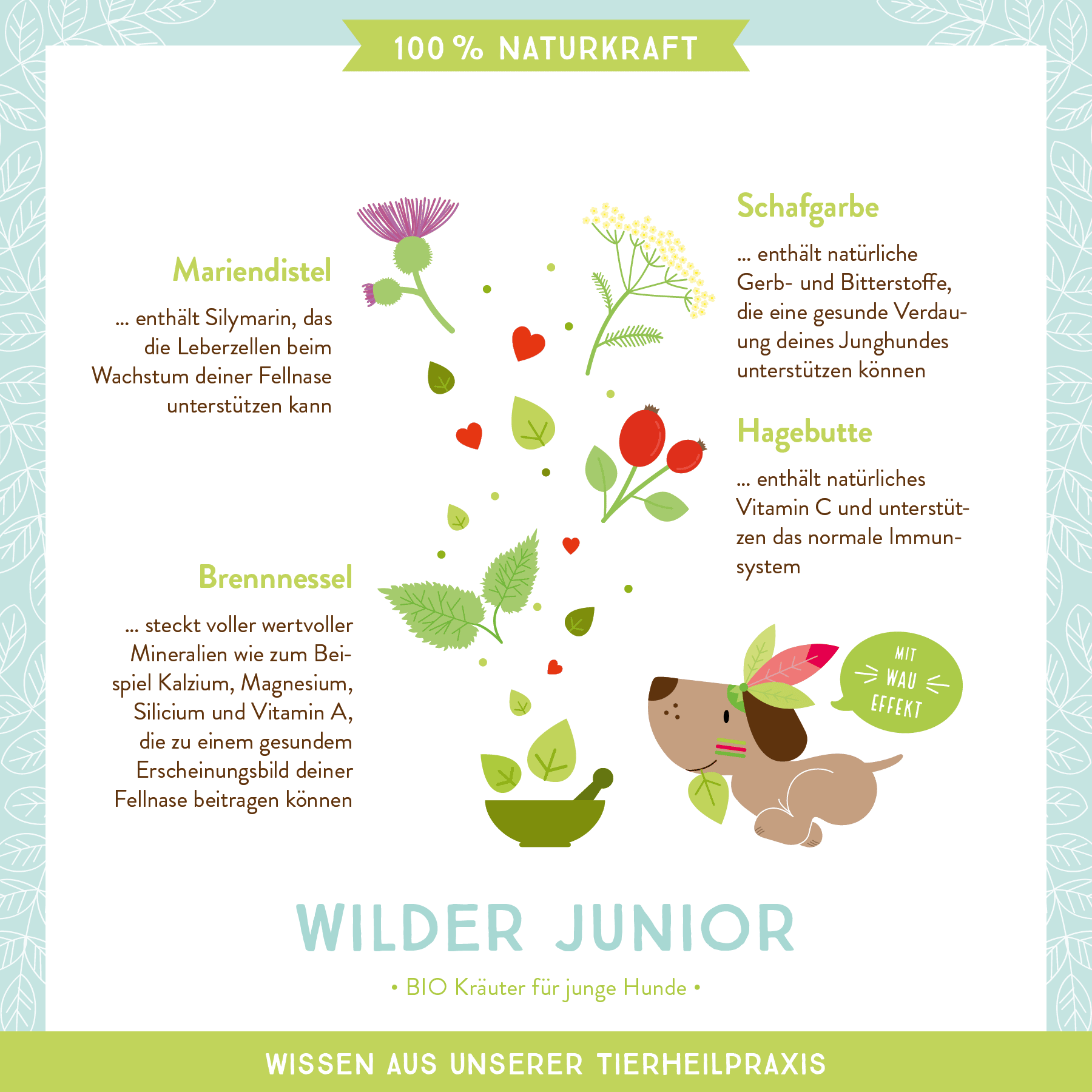 - Pflanzliche Unterstützung für die allgemeine Vitalität & das Wohlbefinden junger Hunde